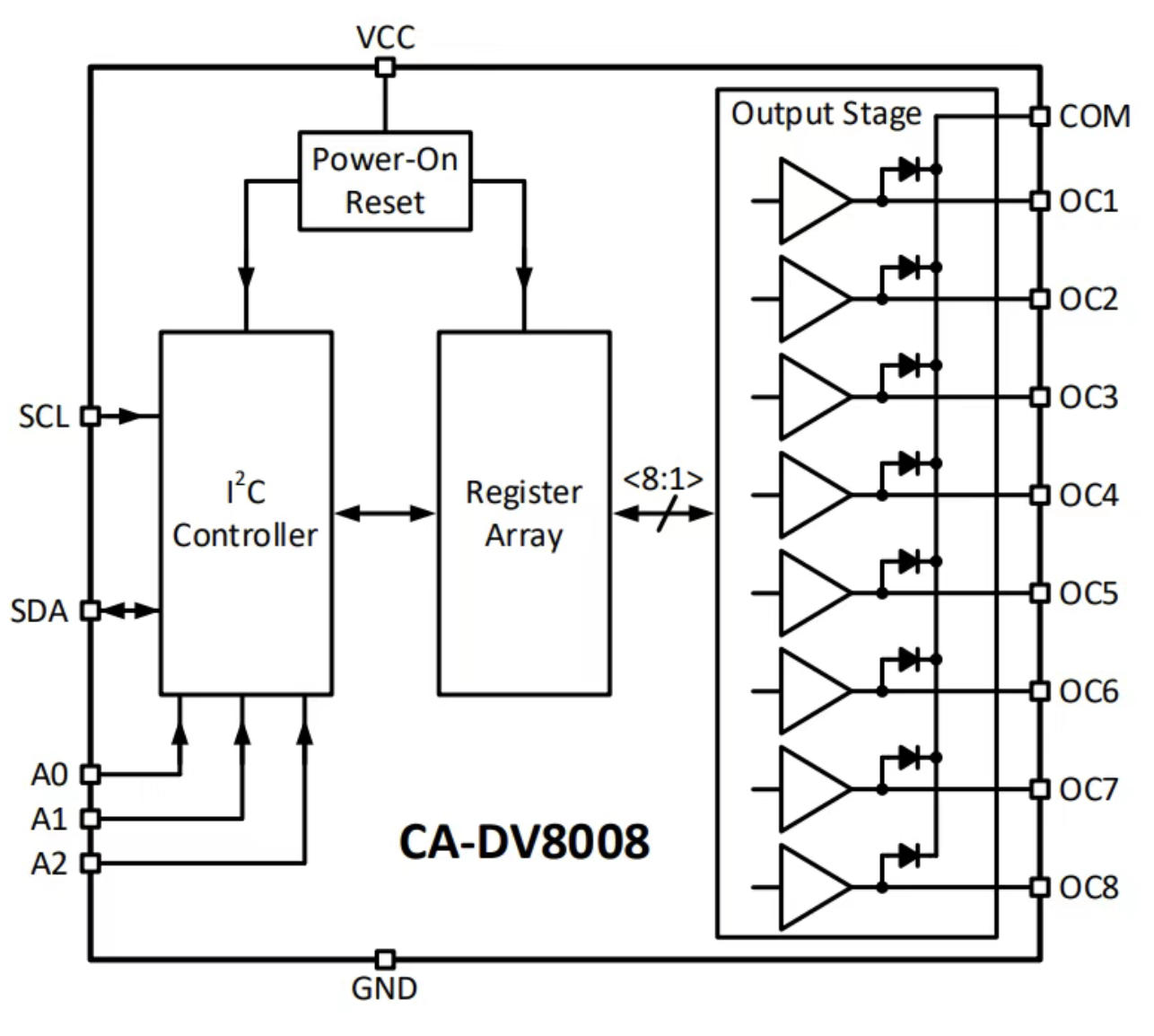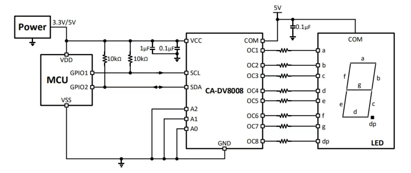 The CA-DV8008 supports a high-speed I²C bus up to 400kHz and has three hardware address configuration pins. It supports up to eight CA-DV8008s connected to the same I²C bus, enabling centralized control of 64 outputs. The SCL and SDA pins use CMOS logic levels, and the logic supply voltage VCC supports a wide input range of 3V to 5.5V, allowing direct connection to 3.3V or 5V microcontrollers and sharing a power supply.